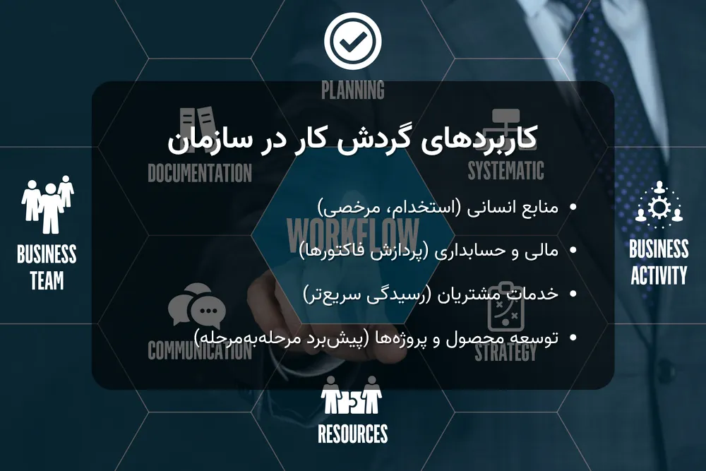 گردش کار چیزی نیست که فقط روی کاغذ تعریف شود و تقریباً در تمام فعالیتهای روزمره سازمانها حضور دارد؛ هر جا که مجموعهای از وظایف باید با نظم و ترتیب مشخصی اجرا شوند، گردش کار در عمل جریان پیدا میکند. شناخت این کاربردها به مدیران کمک میکند فرآیندهای خود را شفافتر کرده و بهرهوری بیشتری به دست آورند. کاربرد گردش کار در سازمانها شامل: